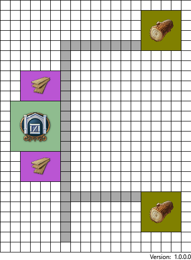 In this layout we will be showing the production chain for timber. The timber production chain is quite large in area as the woodcutters hut needs space to grow trees for the sawmill.